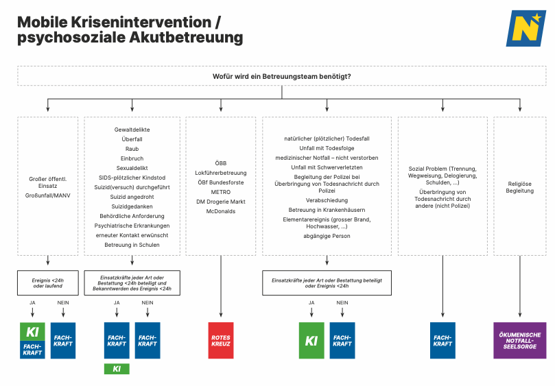 Anhand eines bei Notruf Niederösterreich hinterlegten strukturierten Alarmierungsschemas auf Basis des Leitfadens der Österreich Plattform Krisenintervention/Akutbetreuung werden je nach Anlassfall die erforderlichen Ressourcen bedarfsgerecht eingesetzt und alarmiert.